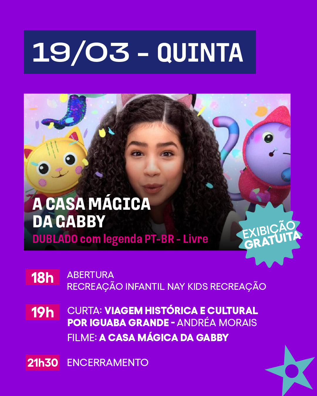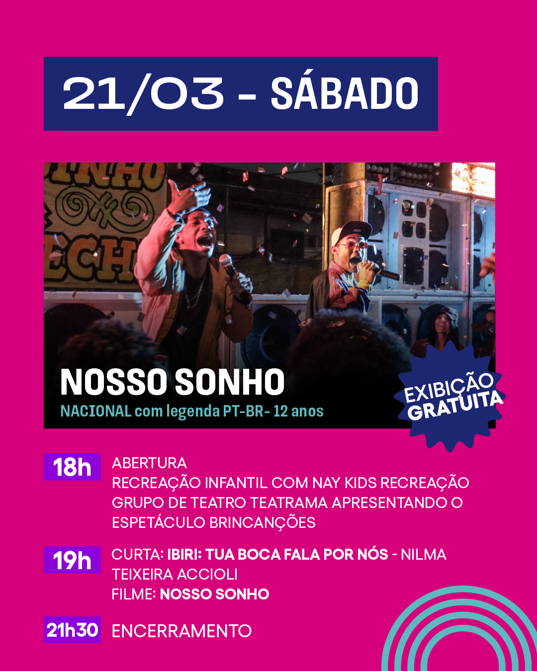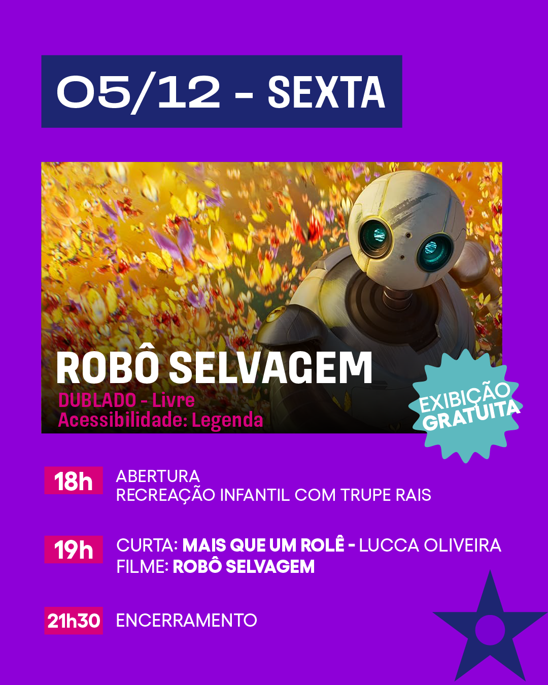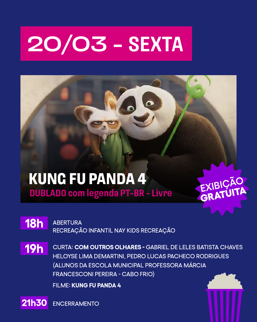 A previsão de término para nosso cinema ao ar livre é às 21h30.