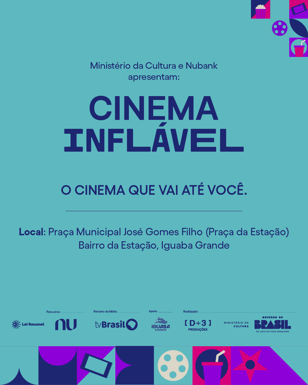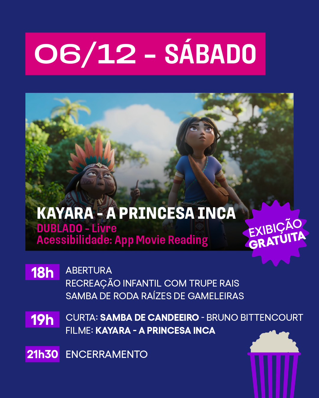 Filme com pipoca fica ainda melhor, né? Teremos distribuição gratuita de pipoca, mas não iremos comercializar alimentos e bebidas.